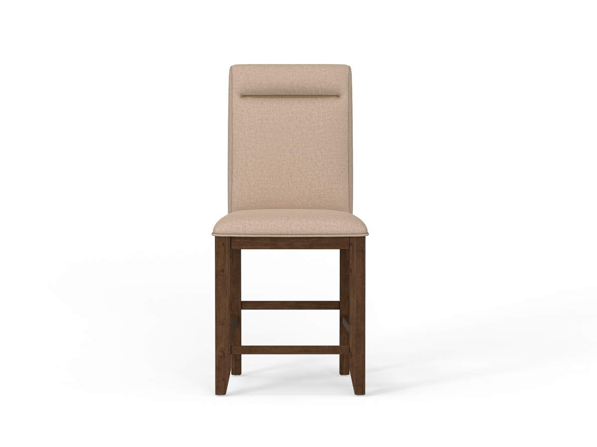 The Toffee Pub Chair offers the same elegance and refined style as the Toffee Side Chair but in a pub height design, making it ideal for elevated dining or gathering spaces. Upholstered in a creamy canvas fabric, the seat and back provide a clean, inviting look that pairs beautifully with a variety of table finishes. A horizontal brass inlay detail on the seat back adds a striking accent, enhancing the chair’s sophisticated style. The toffee-colored wood legs bring warmth and natural contrast, giving the piece a versatile charm that fits seamlessly into both classic and contemporary settings.Read More