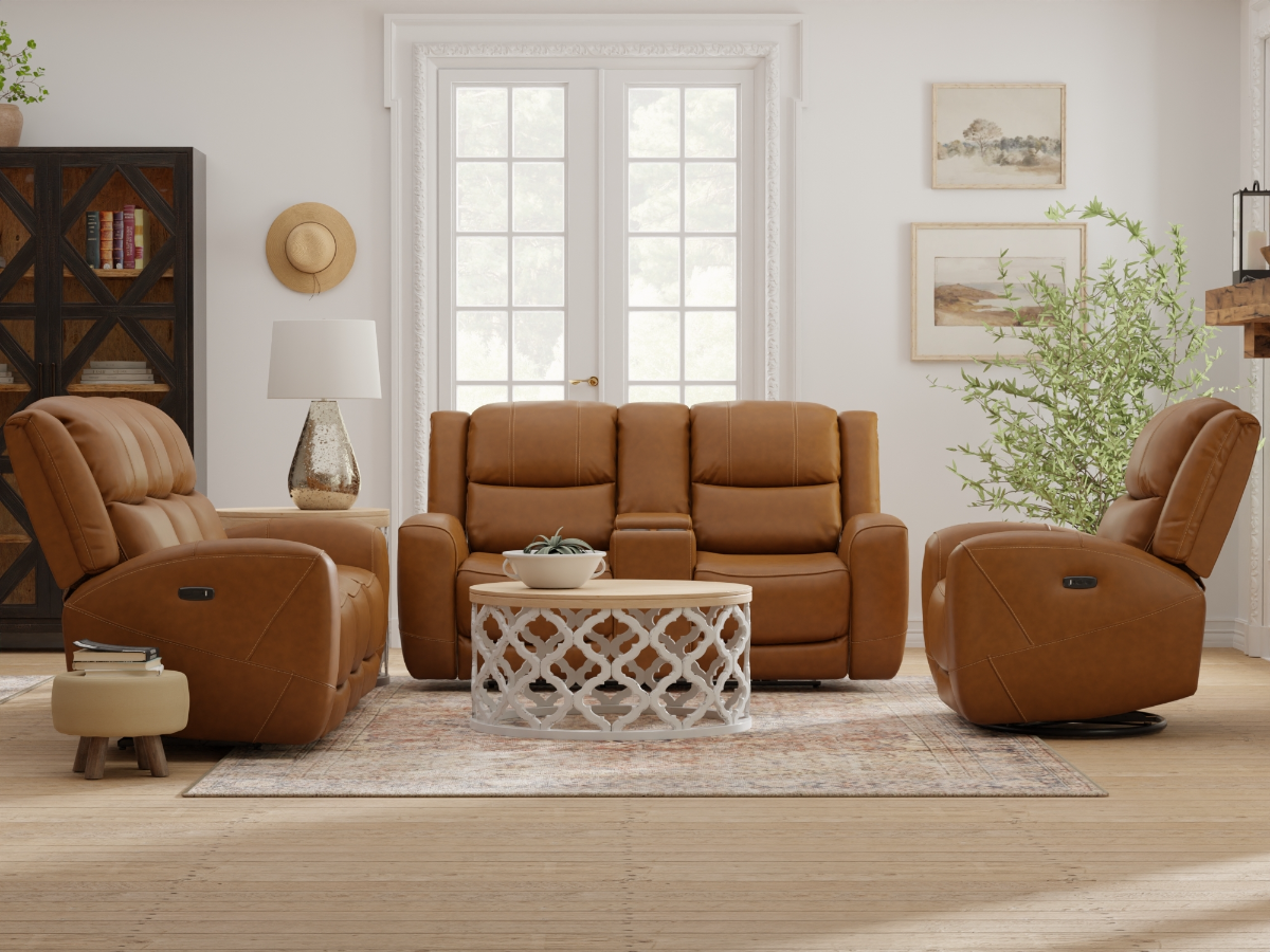 The Toffee Power Leather Loveseat combines style and functionality with its top-grain warm brown leather and durable vinyl on the sides and back. It features power recline and power headrest options, allowing for ultimate comfort. The power buttons on the side include USB-A and USB-C ports for easy device charging. This loveseat also boasts a practical storage console in the middle, complete with three cupholders, making it perfect for relaxing in style. With a 325lb weight capacity, it is both sturdy and inviting.