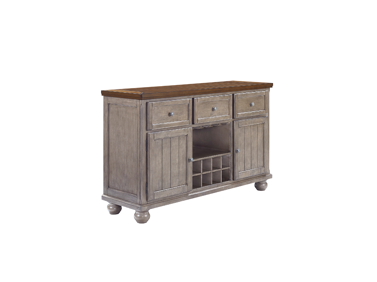 The Travis Server is a versatile and stylish addition to your dining room, offering both functionality and aesthetic appeal. Featuring a rich brown top and a grey washed base, this server seamlessly blends rustic charm with modern design. At the top, you'll find three spacious drawers, perfect for storing dining essentials such as utensils, napkins, and table linens. Below, two doors open to reveal ample storage space for larger items, ensuring your dining area stays organized and clutter-free. The centerpiece of the Travis Server is its integrated wine rack and glass storage, providing a dedicated space for your favorite bottles and stemware. This thoughtful design element not only enhances the server's functionality but also adds a touch of elegance to your dining room. Combining practical storage solutions with a chic design, the Travis Server is an ideal piece for entertaining guests and keeping your dining area tidy and stylish.Read More