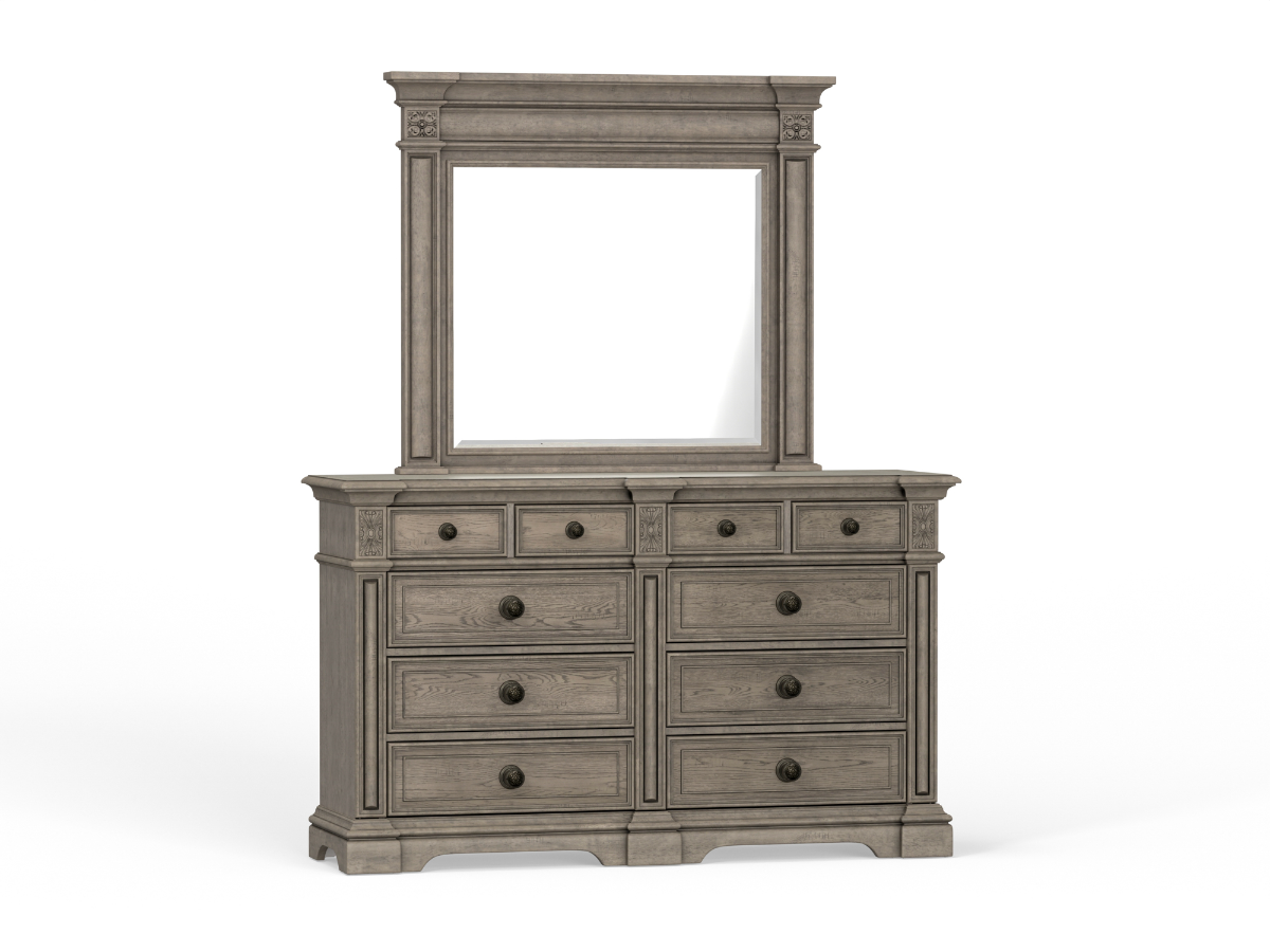 The Tulsa Dresser and Mirror Set combines traditional styling with thoughtful storage features, making it a standout addition to any bedroom. Finished in a versatile gray wash that brings out the natural grain of the wood, this set exudes a timeless look that blends well with both rustic and transitional décor. The dresser features two felt-lined top drawers designed with a faux four-drawer appearance for added visual interest, along with subtle detailing and classic knob-style pulls that enhance the traditional charm.Read More