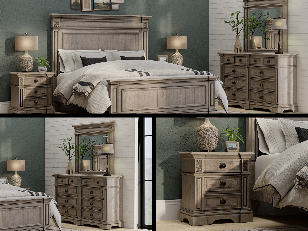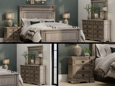 The Tulsa Bedroom Set combines traditional design, durable craftsmanship, and smart storage into a complete package that transforms your space with timeless appeal. Available in both king and queen sizes, the set includes the stately Tulsa Bed with its paneled headboard and footboard, detailed post accents, and a rich gray wash finish that highlights the natural wood grain. Complementing the bed is a matching dresser and mirror, along with a three-drawer nightstand, creating a unified and functional bedroom suite.Read More