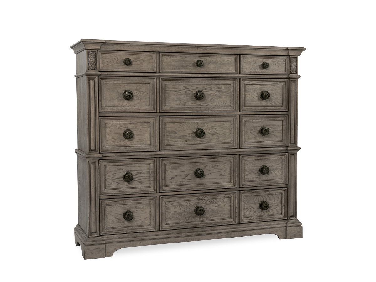 With a total of 15 drawers arranged in five rows of three, this master chest provides exceptional organization for everything from clothing to accessories. The top drawers are felt-lined for storing delicate items, while the bottom drawers are cedar-lined to help preserve your wardrobe and maintain freshness. Ideal for those who value both style and function, the Tulsa Master Chest is a perfect centerpiece for maximizing bedroom storage without sacrificing elegance.