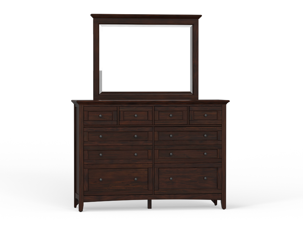This spacious dresser features ten drawers in total. The top row includes four felt-lined drawers, ideal for organizing jewelry, watches, or smaller personal items. Below, six larger drawers offer ample storage for clothing. Built with English dovetail construction, each drawer glides smoothly and is designed for lasting durability. The Tuttle Dresser and Mirror set delivers heirloom-quality craftsmanship with classic design and everyday functionality.
