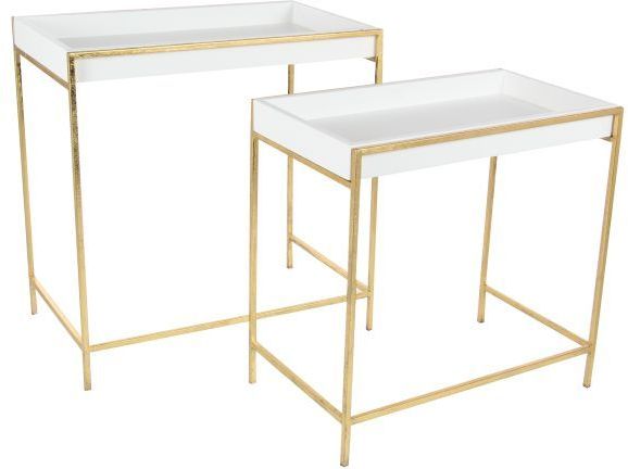 Set of two 22", 20" Modern Reflections metal and wood console tables. Features deep rectangular MDF trays with white finish, polished gold iron legs and frames.Read More