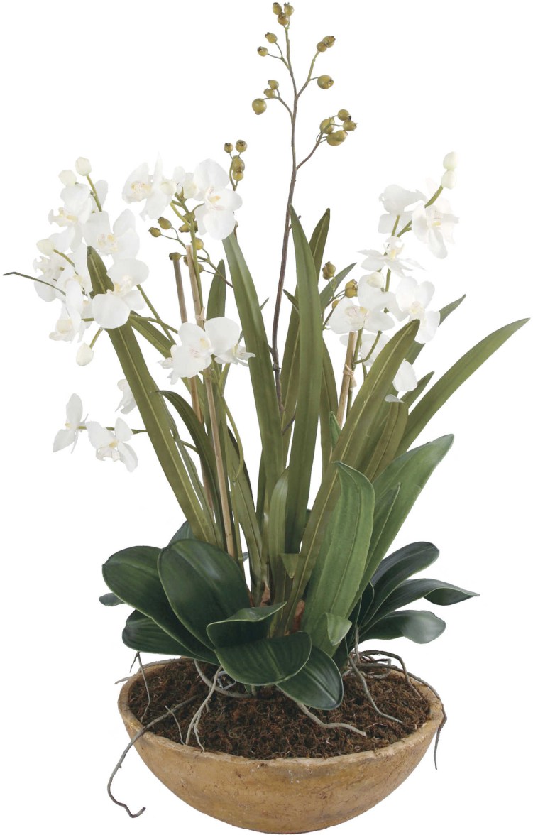 Hand Painted, Natural Brown Dish Garden Of White Moth Orchids Planted In Permanent Soil With Mixed Foliages From The Orchid Family.Read More