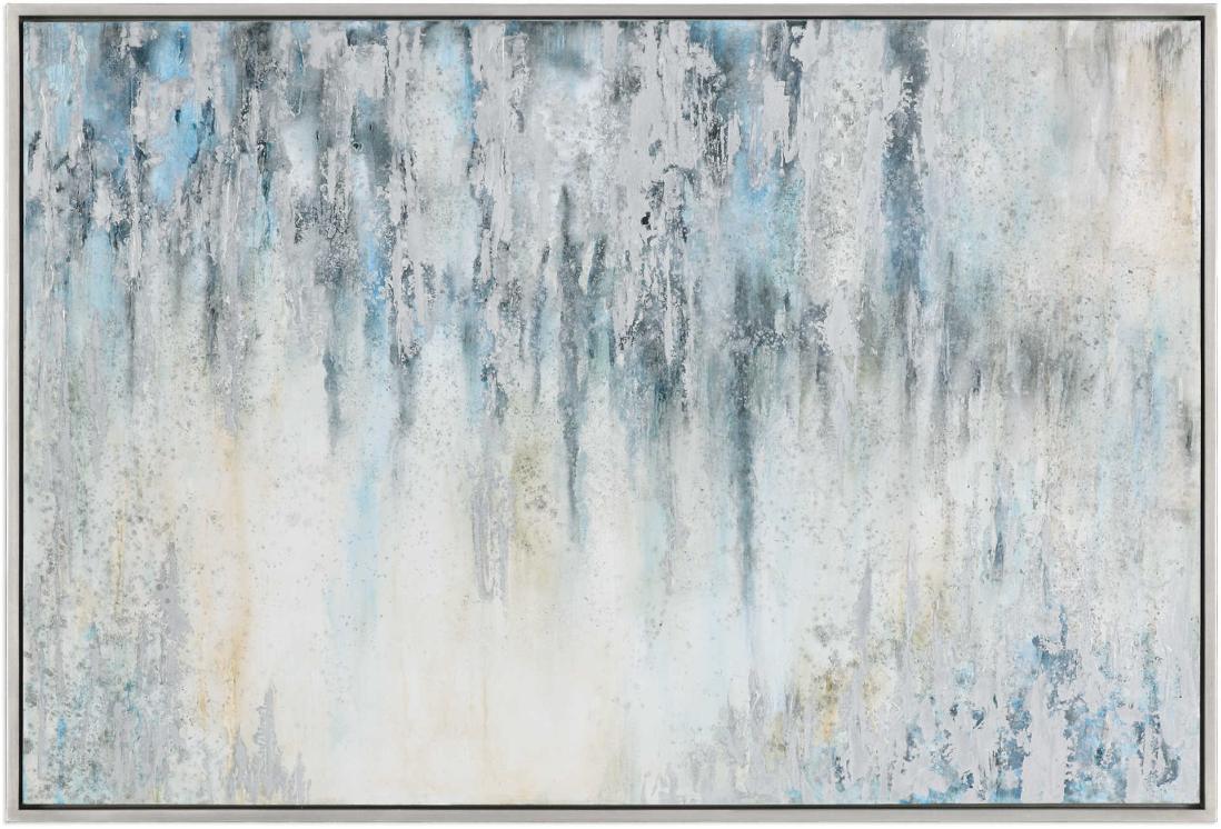 Modern In Design, This Hand Painted Abstract On Canvas Projects An Expressive, Yet Refined Quality. Cool Blue, Gray, And Silver Tones Blend Seamlessly Together On The Canvas, Which Has Been Stretched And Attached To A Wooden Frame. A Petite, Silver Leaf Gallery Frame Completes The Artwork.Read More