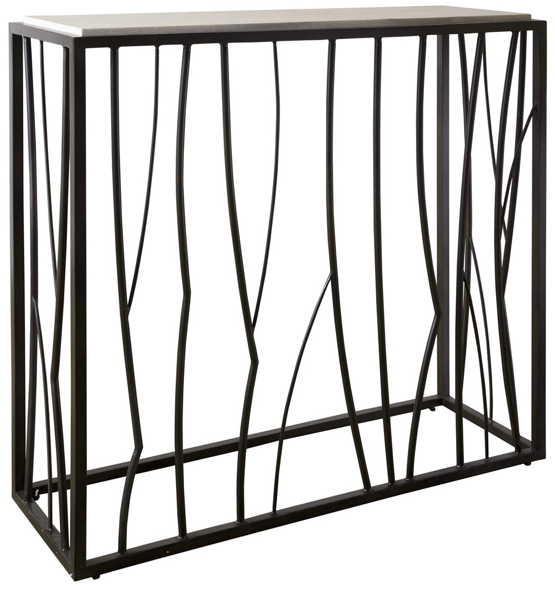Inspired by natural landscapes, this console table features an asymmetrically designed metal base finished in dark iron paired with a natural ivory travertine top. True to the nature of natural materials, each piece will have unique marbling and veining throughout.Read More