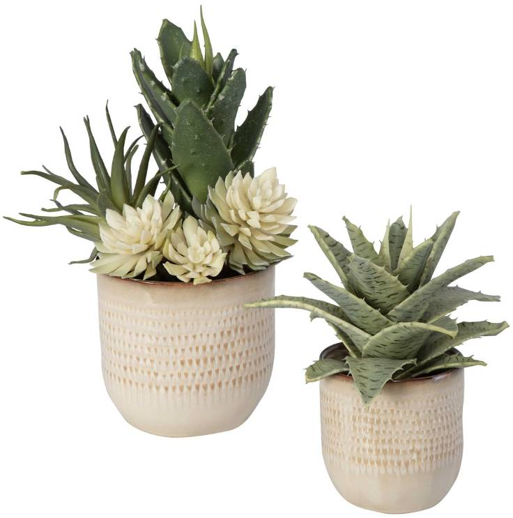 A refreshing blend of spiked succulents set into textured ceramic containers, glazed in neutral tan tones. Crafted to bring the tranquility of the beach into your home, these meticulously designed succulents capture the essence of seaside serenity.Read More