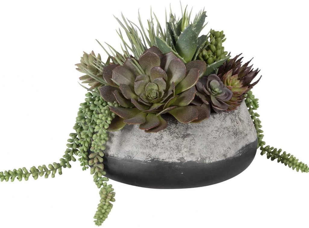 A stunning Yuma centerpiece full of life-life succulents and sedum varities. Deep tones of green and burgundy add to its richness, complementing the dark iron planter with antiqued edge accents.Read More