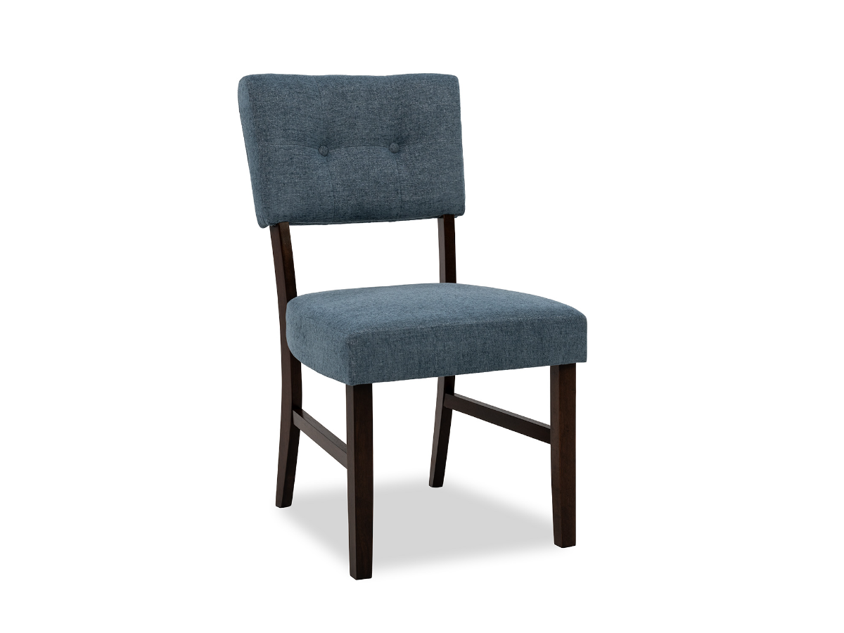 The Villa Side Chair adds an elegant pop of color and refined style to your dining space. Upholstered in a rich blue fabric, this dining chair features a padded seat and button-tufted backrest for both comfort and sophistication. The dark cherry finish on the legs creates a beautiful contrast against the upholstery, offering a warm, traditional foundation with a modern twist. Clean lines and classic detailing make this chair a versatile addition that pairs well with a variety of dining tables and room styles.Read More