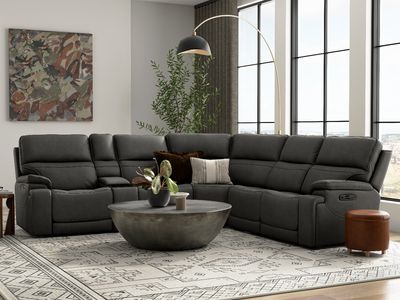 Upholstered in top grain leather with vinyl match on the sides and back, the Vocal Sectional is built on a commercial grade hardwood plywood frame with mortise and tenon joints and a steel seat box for exceptional durability. Triple power reclining allows independent control of recline, headrest, and lumbar with zero gravity positioning, while heat and massage functionality add spa level comfort. Fully immersive audio is integrated directly into the console with easy to use controls, and both left and right side facing recliners include wireless remotes with heat and massage and a one touch home button. Hidden cupholders are built into armrest pieces, while the console features removable stainless steel cupholders, wireless charging, USB Type A and Type C ports, and deep storage to keep everything organized and within reach.