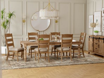 The Warner Dining Set blends timeless design with everyday functionality, creating a warm and inviting centerpiece for your dining room. This set includes the Warner Dining Table and six Side Chairs, giving you plenty of seating for family meals or entertaining guests. Crafted from mindi solids and mahogany veneers, the table showcases a light brown finish that highlights the natural wood grain. Elegant turned legs add a traditional touch, while a hidden leaf expands the table by 2 feet, offering flexibility for larger gatherings.Read More