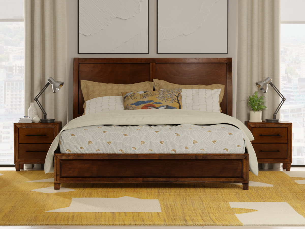 The Woodward Bed brings timeless style and warmth to the bedroom with its classic sleigh silhouette and rich walnut finish.