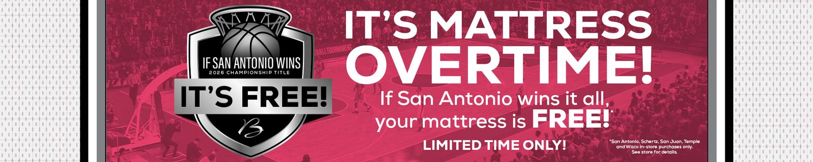 For a limited time, shoppers at the San Antonio, Schertz, Temple, Waco, and San Juan locations of Bob Mills Furniture have another chance to win it all. We’re taking this event into overtime, and now when you purchase any qualifying mattress, your purchase could be completely free if San Antonio goes all the way and wins the championship this season.